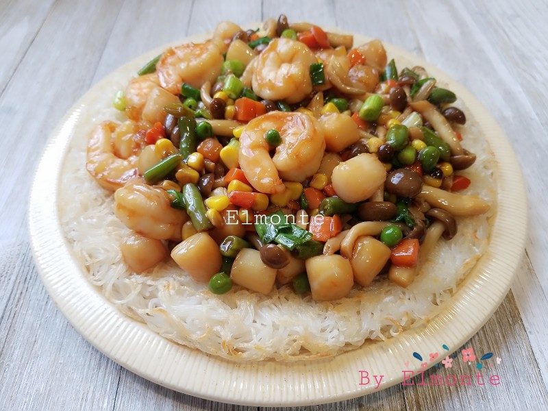 干米粉适量;鸿禧菇1包(150)g;虾仁10来只;鲜带子适量;杂菜1碗;