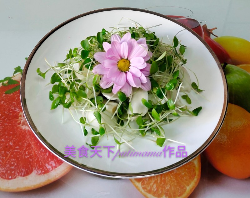 3:将百合与香椿芽轻轻拌至均匀(根根个人需要可调制碗汁拌至),然后点缀一朵粉色的鲜花,使菜品格外清新淡雅,对于即将到来的新春佳节,端上团聚的餐桌定显脱俗,是一种意境之美、享受优雅浪漫的年宴佳肴。