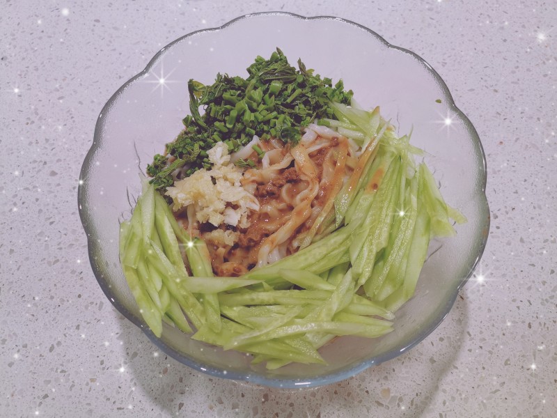 5:最后将香椿末、黄瓜丝码在煮好的面条上,倒入适量碗汁,再加少许蒜泥,拌匀即可。