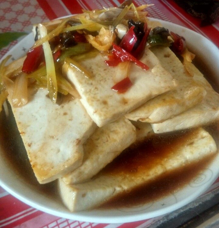 2:将炸好的豆腐码盘。将木耳泡发好的木耳切丁,姜切丝。辣椒切丝,蒜切丁,葱切丝。调汁锅内倒入植物油,8成热,下葱丝,木耳丁,姜丝,辣椒丝,蒜丁,加入适量老抽,盐,味精,生抽,料酒翻炒入味,汤汁浓厚。