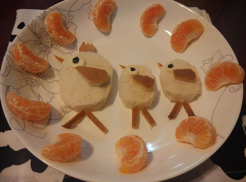 3:用土司白色部分切几个椭圆形作小鸡的身体,再用土司边切几异形做翅,嘴,脚,大鸡还切了一个皇冠,嘻嘻