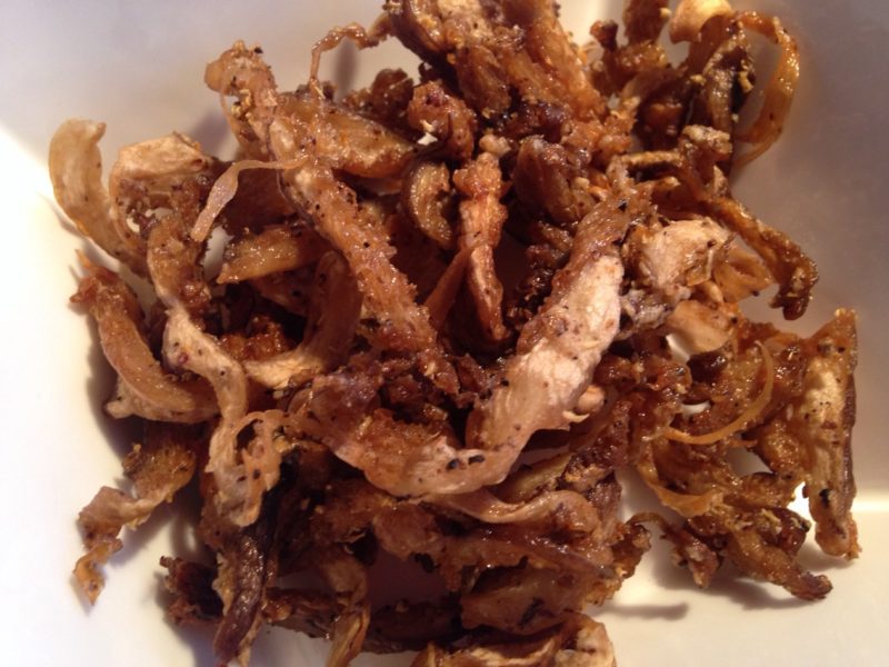 9:炸好的平菇,用吸油纸巾吸下油,撒上自己喜欢的椒盐或是孜然就可以了。