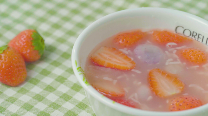 5:等小圆子浮起后倒入草莓煮至沸腾后再煮一会儿