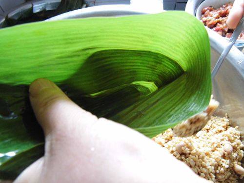 9:取两——三张粽叶重叠,卷成漏斗状,放入拌好的糯米。