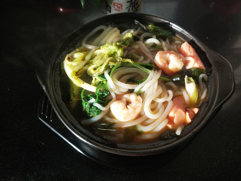 干米线适量;平菇少许;虾少许;小油菜少许;大骨汤适量;