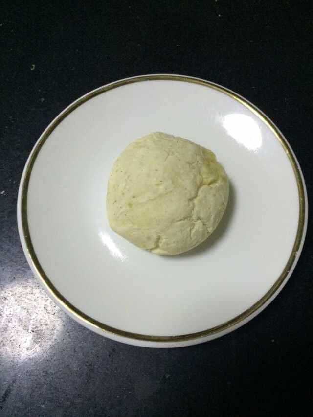 9:取小部分薯面、搓成团、再压扁,中间用拇指稍用力按一下形成一个小窝。