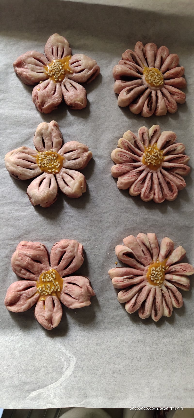 7:每个花朵的中心刷点蛋黄液,撒点白芝麻,这样就可以上预热好的烤箱。