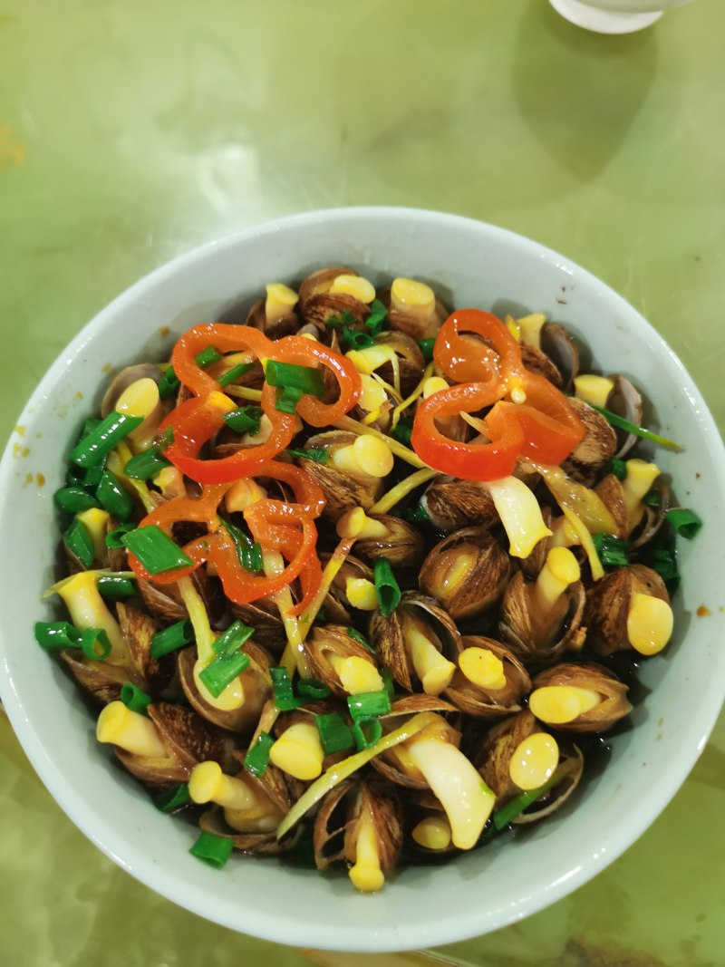 2:海蛏吐完沙多洗几遍,只到水清澈没泥沙,拿一个容器把海蛏有2个触须的头朝下插满客器。撒上点姜丝,红椒。