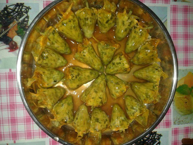 15:把煮的紫苏放但蒸好的南瓜花酿上面。好了,健康美味!