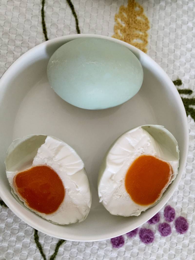 9:煮好的咸鹅蛋切开,搭配大碴子粥吃那叫一个香。其实我家很少切开吃,每次都是一人一个,这个夏天真没少吃咸蛋,实际上这鹅蛋也是流油的,只是凉透了才切,看上去没有那么多油。