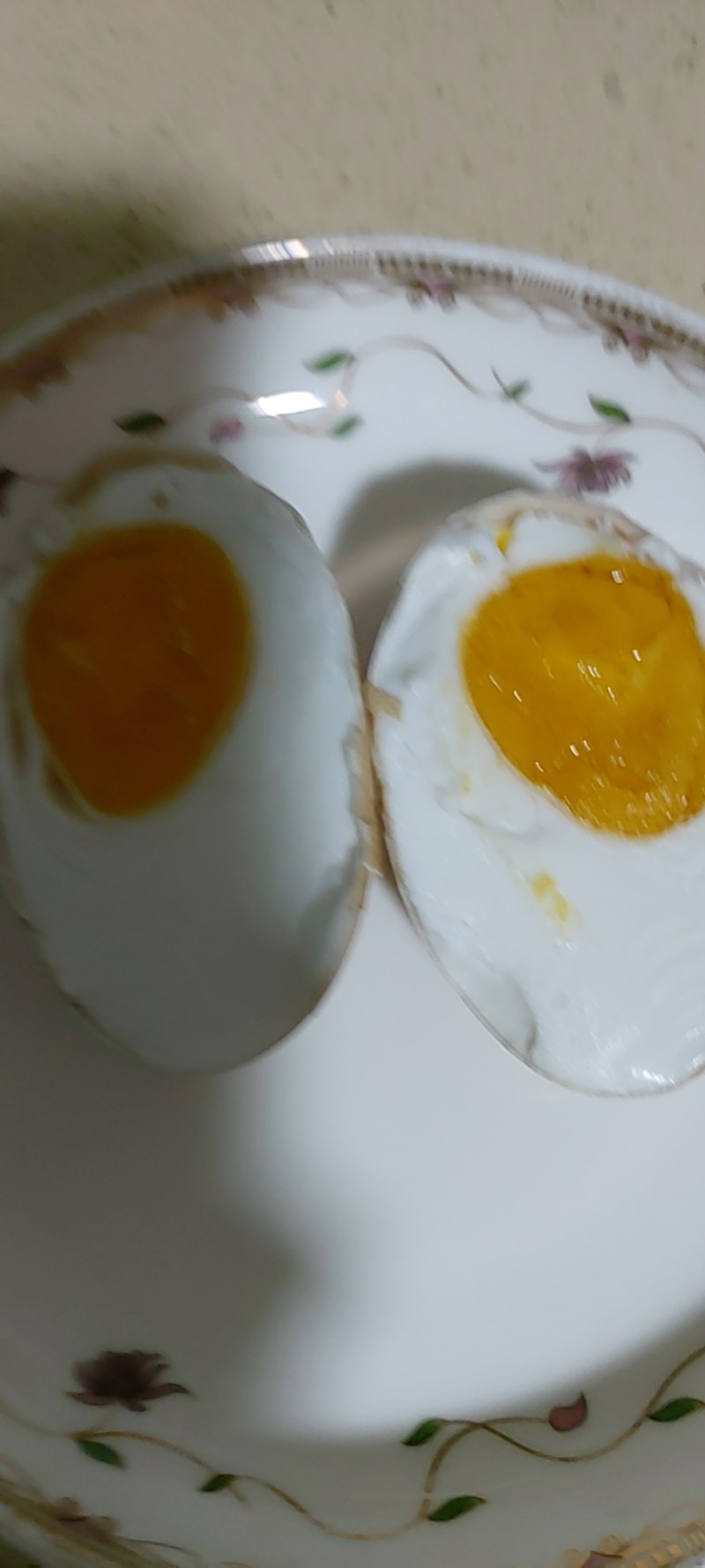 6:经过了漫长的等待,煮好一个自己腌制的鸭蛋,切开,哇,颜色不错吧,鸭蛋清的味道也不是很咸,刚刚好哦