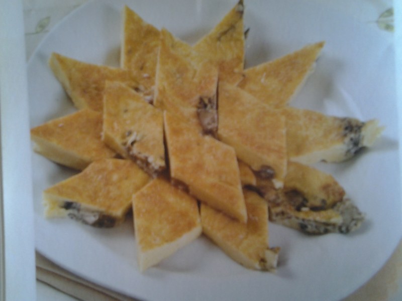 8:把剩下的培根丁和杏鲍菇丁倒入锅中炒至全熟,倒入蛋饼中