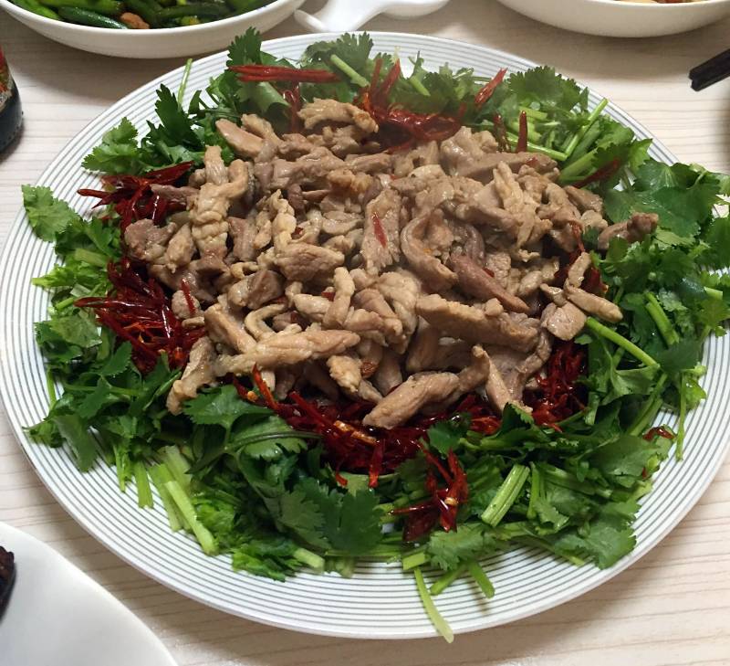 猪瘦肉100g;香菜100g;干红辣椒丝50g;