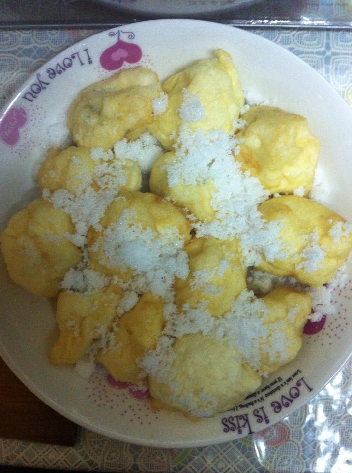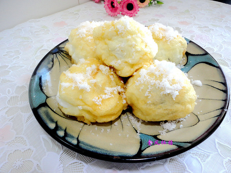3:油温三成热的时候,把豆沙球在蛋泡糊里转一圈,浇油炸。金黄色出锅。