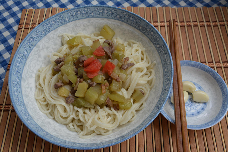 9:面条煮好,拌上茄丁卤,开吃。