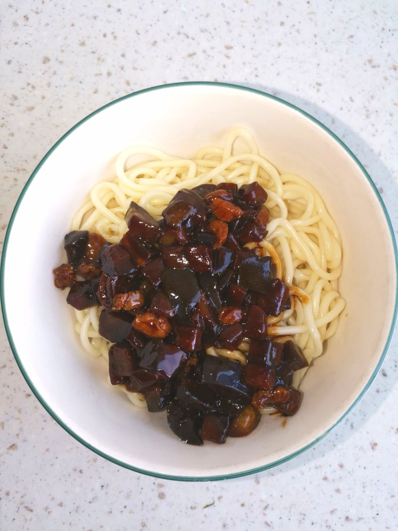 4:面条下锅煮熟后用白开水过凉,捞入碗内浇上切丁即可开餐。