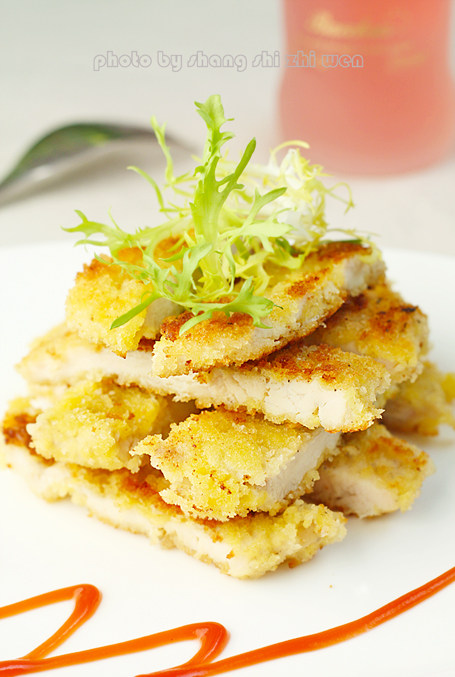 1、鸡肉的纤维很清晰,用刀背逆着纤维的方向轻剁,斩断纤维使肉质易嫩。2、鸡肉沾上面包糖后一定要小火煎,火大面包糠易焦。