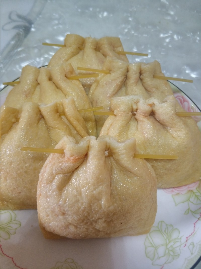 11:然后平底锅放油烧热,把福袋刷上蛋液,煎至金黄色即可,也可以用油炸