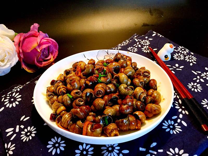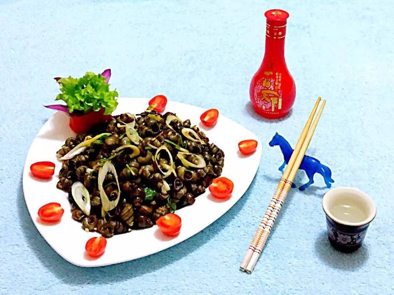 9:田螺炒好撒上香菜、葱段、蒜末翻炒一下即可出锅