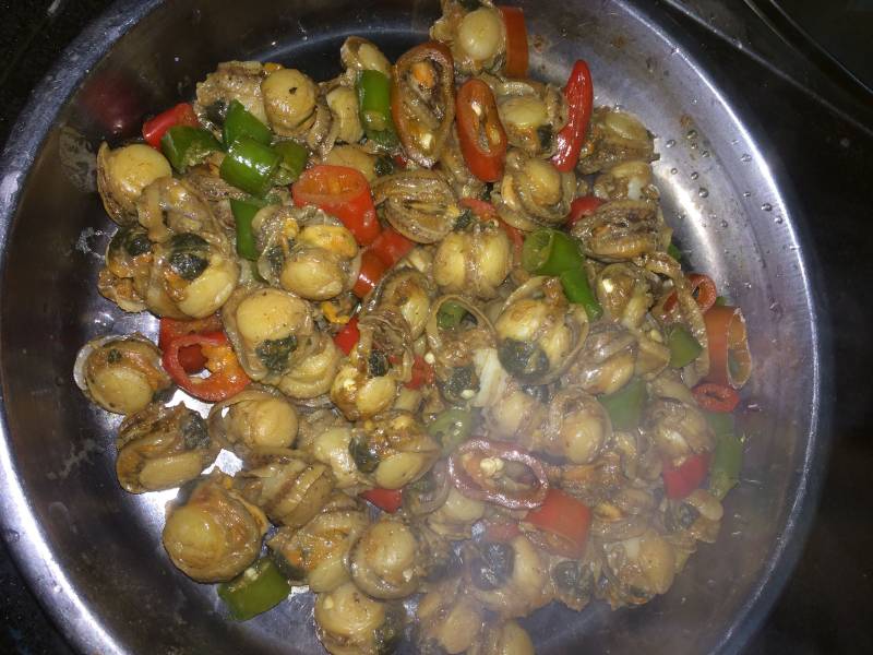 3:把锅烧热放油放蒜放辣椒翻一翻,倒入贝螺,放调料,放水,最后差不多起锅的时候放定粉,翻炒即可出锅