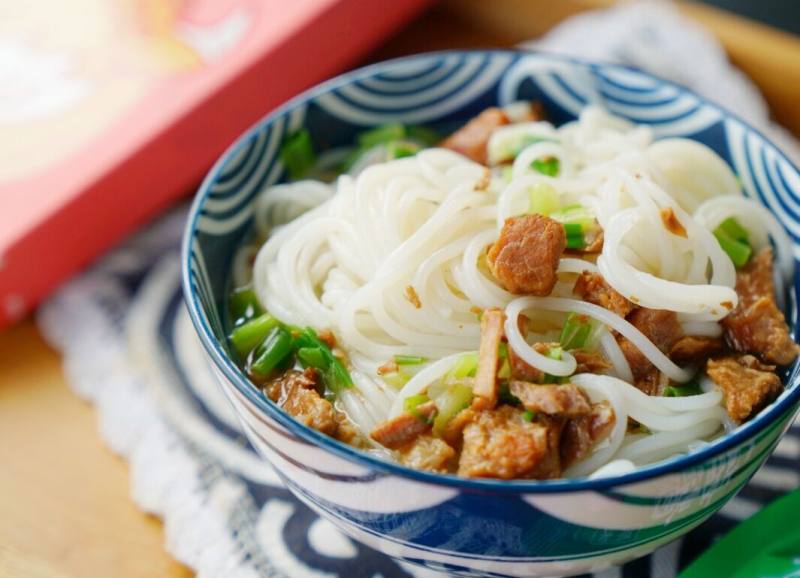 4:加入适量的葱花提个鲜,将煮好的鲜汤牛肉丁配在米粉里即可。