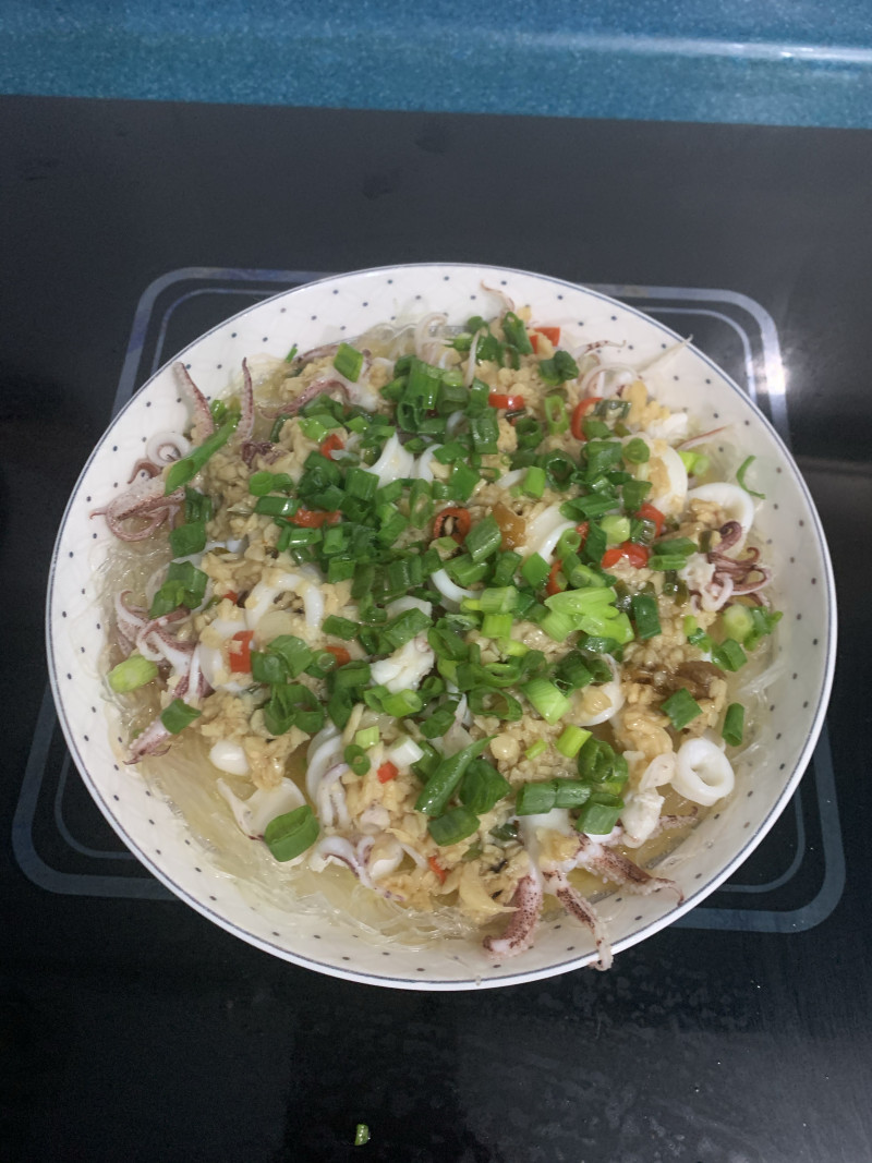 3:粉丝摆盆底,再铺上鲜鱿鱼,将调好的酱汁放在最上面,上火蒸5分钟。