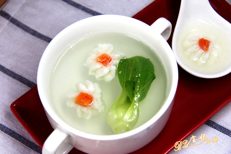 7:锅里加入鸡汤,烧开后,烫一下洗净的小油菜,捞出。开文火,把鱼蓉装入裱花袋里,选择合适的花嘴,锅里的鸡汤有点烫手时花嘴紧挨着鸡汤直接挤入鱼蓉,快速把胡萝卜切的花蕊插在花心上,文火汆熟。(这个过程有点难度,需要几次练习),调味盛出。