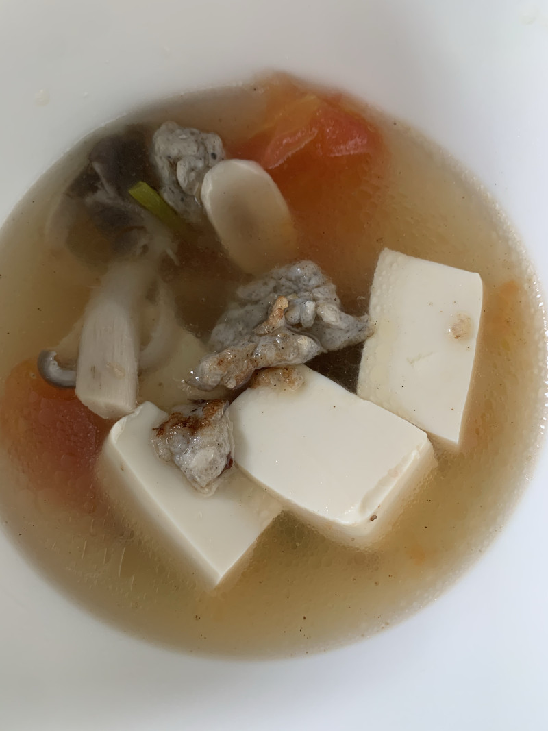 1:鱼肉放生抽葱姜腌一下,鲜菇撕小朵,番茄半个切片,日本豆腐一块。