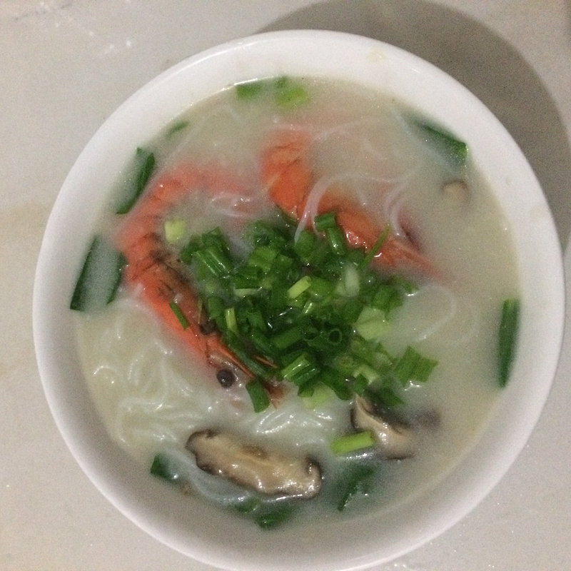 米粉适量;鲜虾适量;干香菇3朵;青菜适量;面粉少许;猪瘦肉适量;