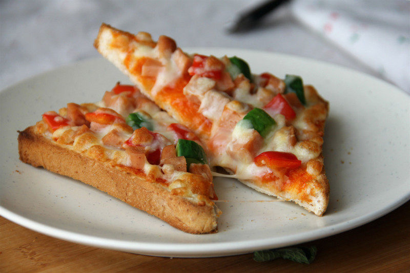 3:把配料依次撒在吐司面包上,放入预热200℃的烤箱上层5min左右,表面芝士融化即可,