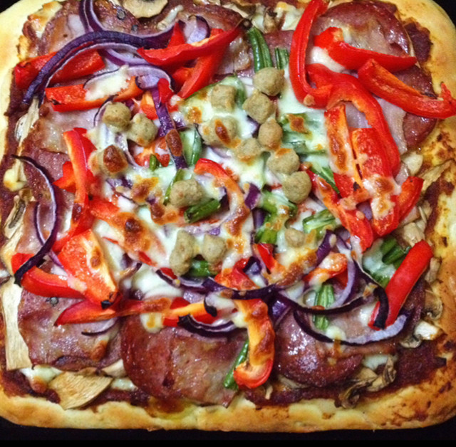 7:每次都做成巨无霸,自己做料可以放得足足的,蘑菇之类容易出水的蔬菜,可以提前烤一下,不影响口感。我喜欢辣的,发现细辣椒放披萨里也很好吃。喜欢披萨边颜色好看的,可以烤前在边上刷上蛋液或者蜂蜜水。放面饼之前烤盘里油刷多点面饼口感会更脆些。祝大家都能做出自己喜爱的披萨。
