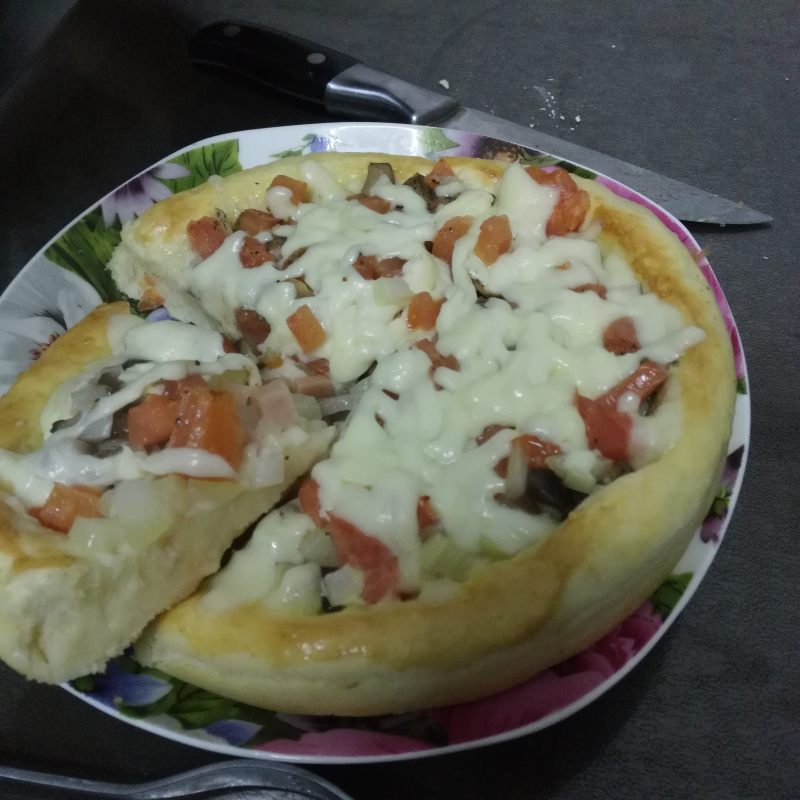 4:食材一定要摆放均匀芝士可以多放一些,最后在淋上一些甜辣酱可以更入味这样做出来的披萨会更拉丝