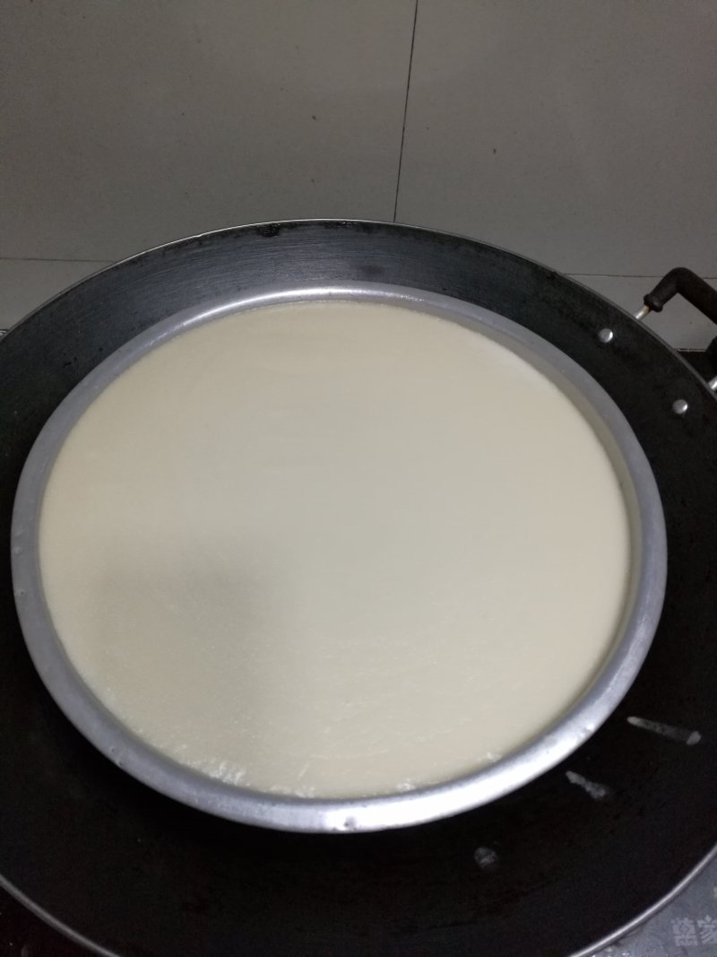 4:糖水煮开时,倒入250克的生桨(椰汁方法如同);