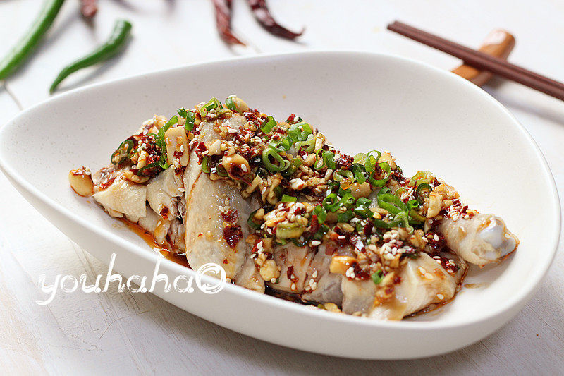 8:将鸡肉切块码放于盘中,将调好的料汁倒在鸡肉上(这步忘拍了)。锅中烧热少许油,和果喜欢麻辣味重的,可在凉油时加入花椒粒和干辣椒炸香。最后将热油淋在鸡肉上即可。
