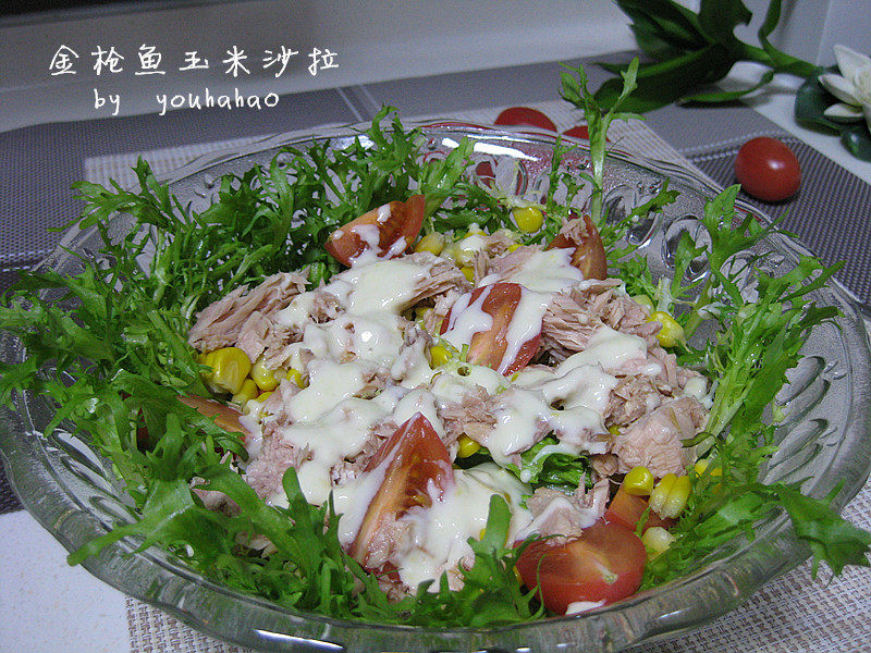 水浸金枪鱼罐头一个180克;甜玉米粒60克;苦菊半棵;生菜半棵;圣女果6个;