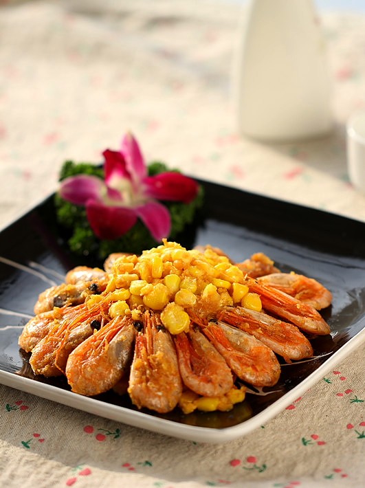 6:倒入玉米和虾快速翻炒均匀,再加适量糖,鸡精翻炒均匀即可。