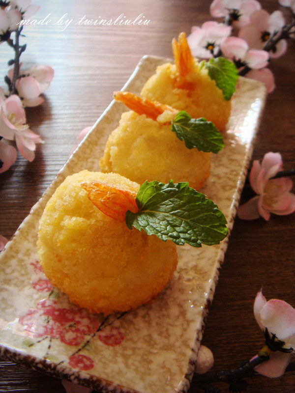 8:将土豆泥包裹在虾的外面呈球形,虾的小尾巴露在外面。