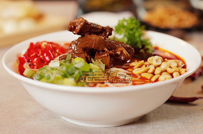 5:另起一锅,水烧开,将米粉氽一下,盛入碗中,将压好的牛肉及汤倒入碗中,味中的可再加些生抽、醋、香油,辣椒油,最后撒上香菜。