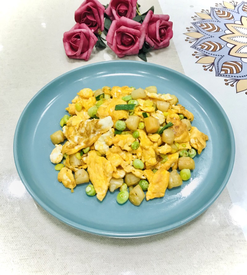 5:鸡蛋炒熟后加入豌豆、瑶柱一起翻炒。