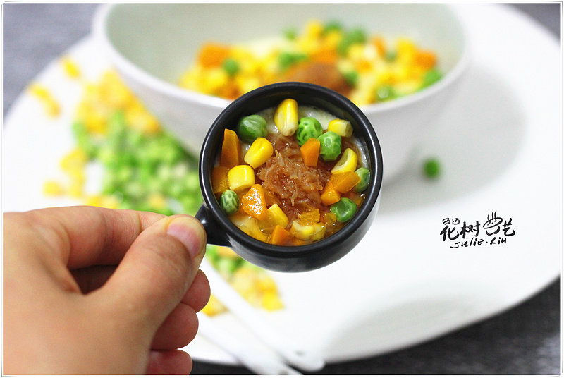 7:出锅后撒入焯水后的青豆和玉米粒,加入瑶柱丝,点入适量芝麻油