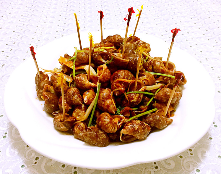 8:炒好的香螺盛入盘中,插入牙签