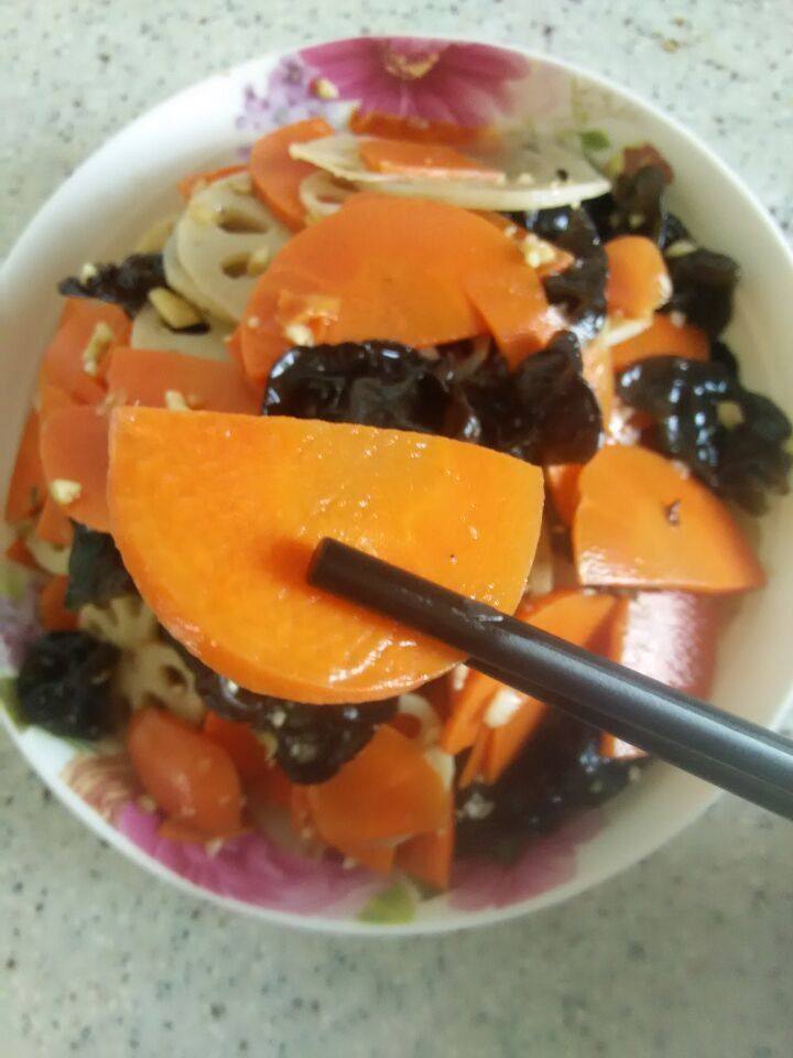 7:把藕,胡萝卜,木耳一起放进盆里,放十三香,蒜、酱油、料酒、凉拌醋、盐、香油、搅拌均匀。