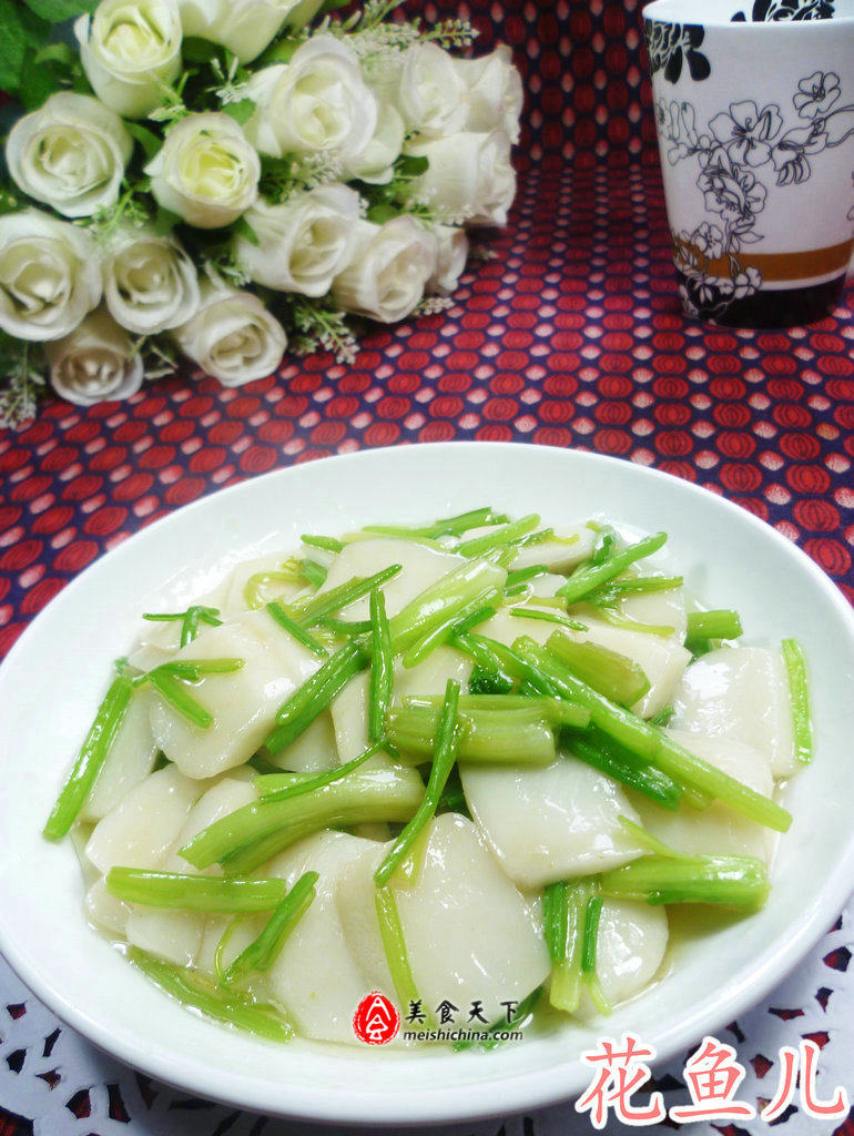 只用盐调味,口味比较清淡,年糕入锅后,要不停翻炒,以免粘锅。