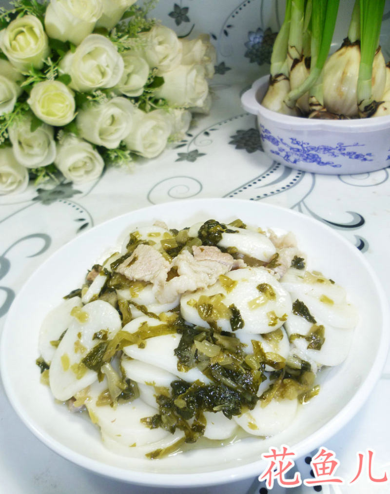 1:材料:咸菜(已清洗切碎)、五花肉(已切)、年糕