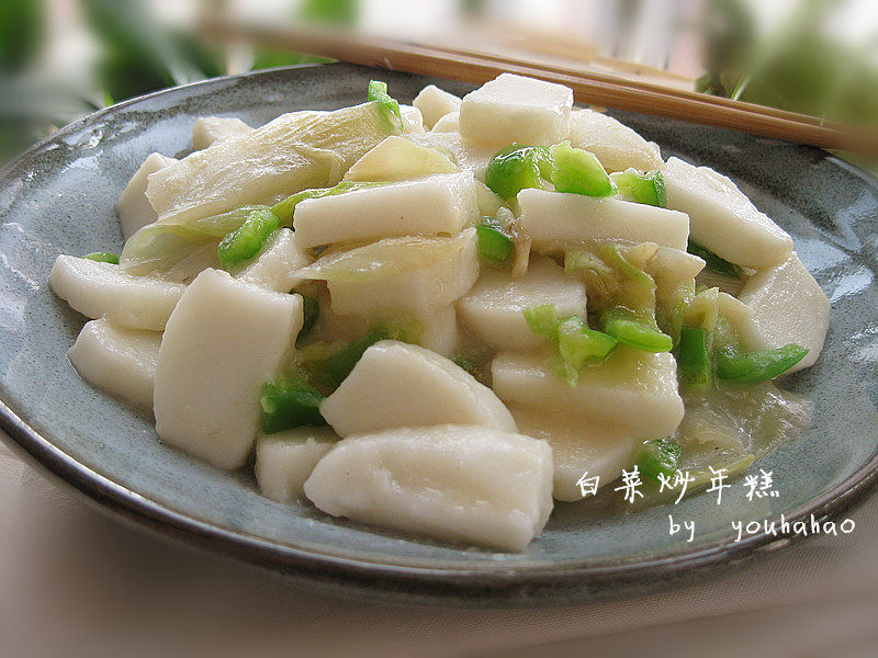 9:至白菜已变软,快熟时,放入年糕翻炒;