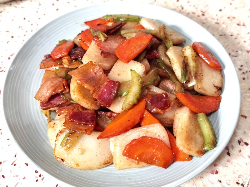 3:一小段胡萝卜切片,西芹切片,蒜头切粒,放凉的咸肉切成大概比一元硬币稍厚的片,胡萝卜和西芹也可以换成青红椒。