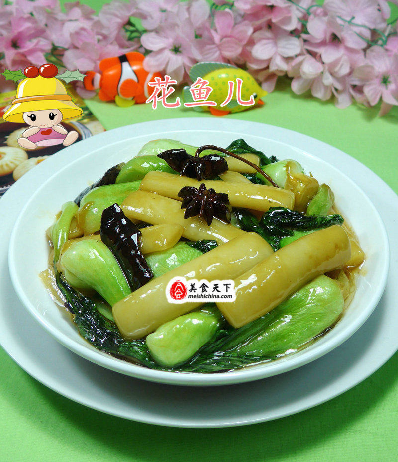 2:烧锅倒油烧热,下入已洗净的青菜,搁入桂皮和大料翻炒一下。