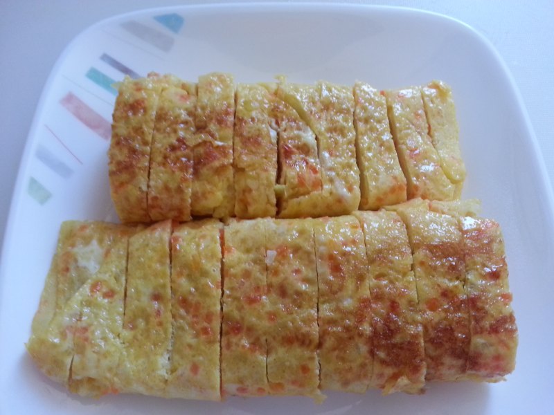 2:把炒好的食材放入鸡蛋液中,搅拌均匀。锅里放油,小火,开始煎鸡蛋。待鸡蛋稍稍有些凝固,就用平铲轻轻的开始翻卷,每翻一次就要用铲子把卷好的鸡蛋压实,以免松开,这个过程动作一定要轻柔,以免蛋卷破裂。卷好以后,翻面稍稍再煎一下即可出锅。
