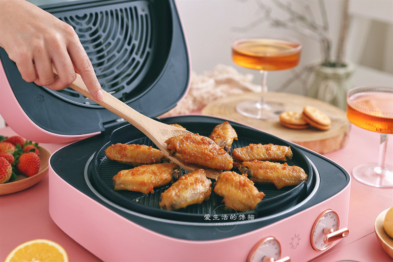 6:准备好锅具,我用的是大宇旋转烤盘,因为鸡翅有水分,所以会在烤盘上刷一层薄油,能起到防粘皮的作用。