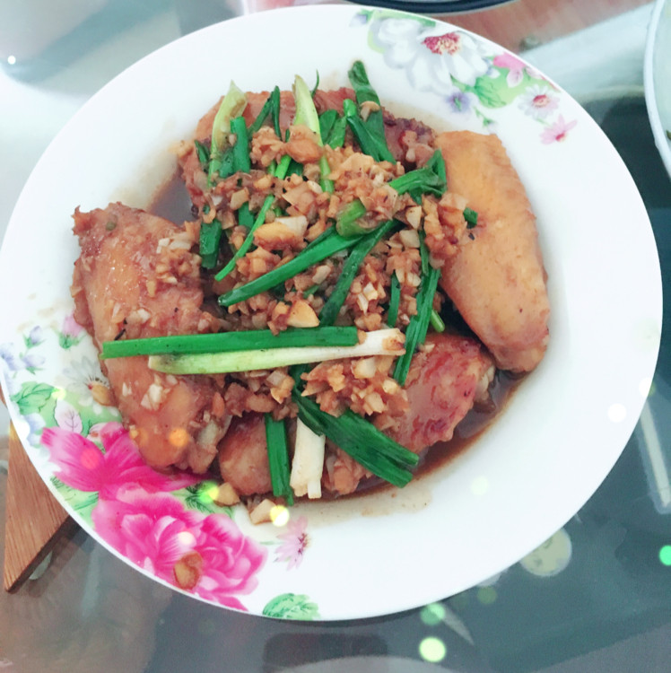 3:锅底热油,然后依次放入鸡翅小火煎至两面微微焦黄;然后在将蒜末撒在鸡翅上,稍微煎一下,同时也煎一下蒜末,这样可以增加蒜的香味;最后加点生抽,在加点热水,微微没过鸡翅,然后大火收汁,最后如果腌制的时候放盐少的话可以在加点盐,调下咸淡,就可以出锅了,最后在撒上点小葱就可以享用了~